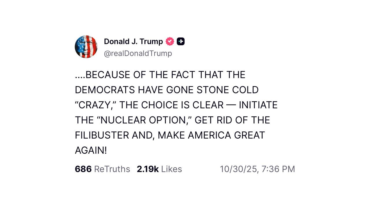 By calling for the end of the filibuster, Trump is doing what he always does when boxed in: shift the blame, torch the institution, and claim victory in the ashes.