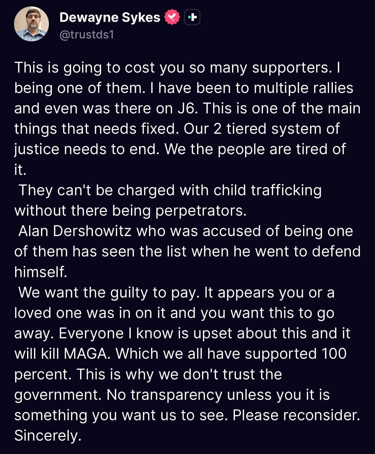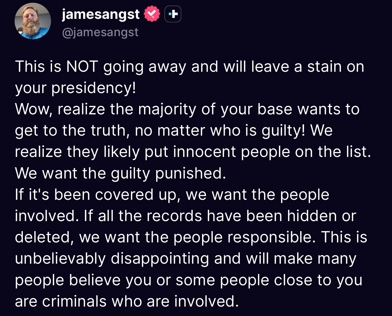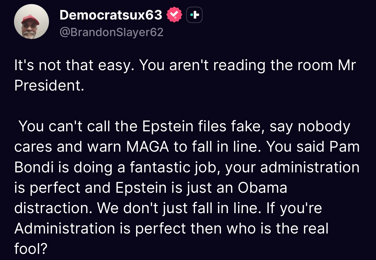 I have been on Truth Social to cover Trump since the first day it became active, and have read every post. The people on that platform are hardcore MAGA cultists who are typically intensely loyal. But his dismissive post on Epstein drew a tidal wave of angry responses like I have never seen before. So far, Trump has received over 45,000 replies, over 90% negative. Here are some examples: