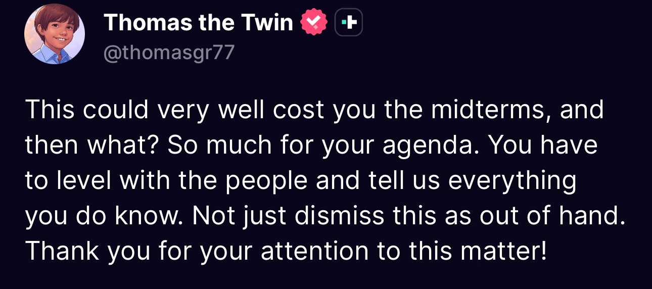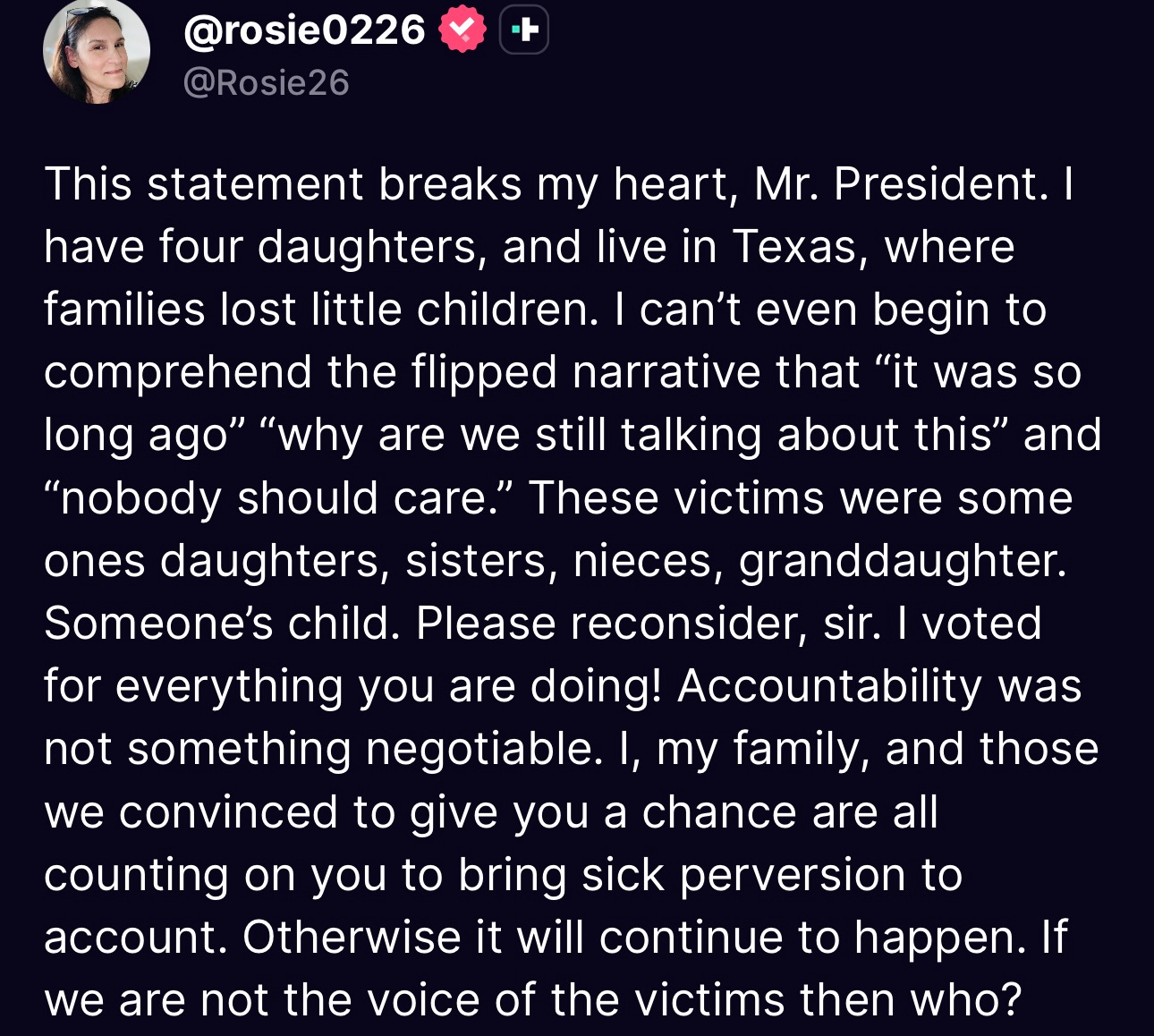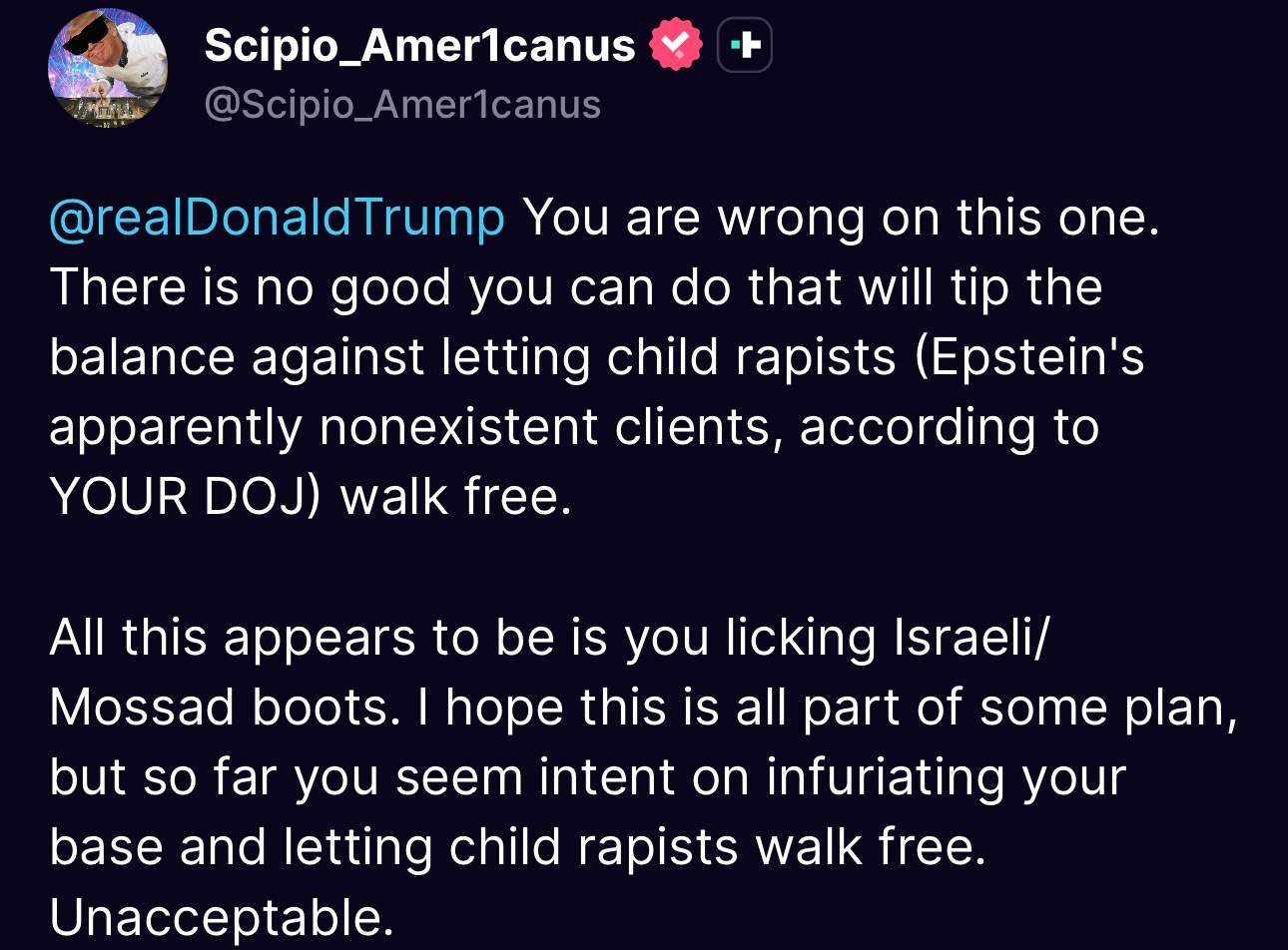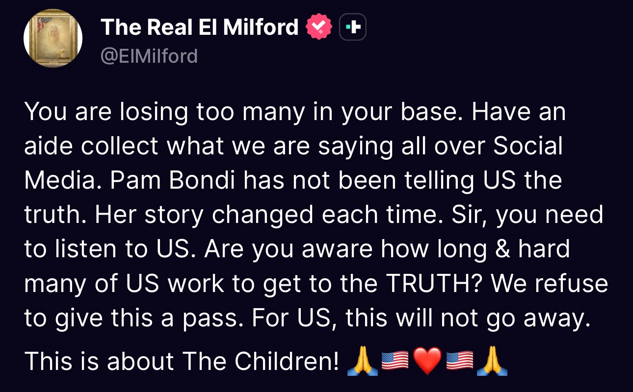 I have been on Truth Social to cover Trump since the first day it became active, and have read every post. The people on that platform are hardcore MAGA cultists who are typically intensely loyal. But his dismissive post on Epstein drew a tidal wave of angry responses like I have never seen before. So far, Trump has received over 45,000 replies, over 90% negative. Here are some examples: