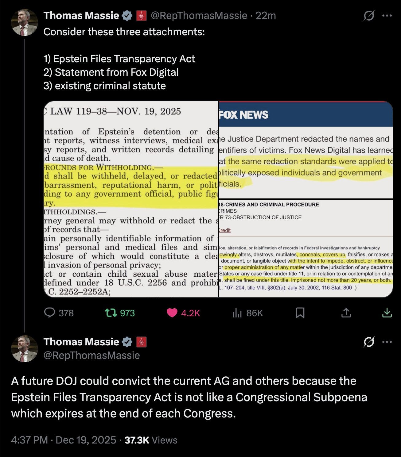 Members of Congress who authored and enforced the law were unequivocal. Democratic lawmakers, including those who worked alongside Republican sponsors to pass the Act, stated publicly that the DOJ’s production did not comply with statutory requirements or court orders. They noted the absence of required explanations for redactions and the failure to produce draft indictments and other investigative materials known to exist. Some warned that contempt proceedings, impeachment inquiries, or criminal referrals could follow if obstruction continues. Representative Thomas Massie (R-KY) said the Trump administration “grossly” violated the law he helped author along with Representative Ro Khanna (D-CA). “A future DOJ could convict the current AG and others because the Epstein Files Transparency Act is not like a Congressional Subpoena which expires at the end of each Congress,” he added on X. Khanna was blunt: “The DOJ’s document dump of hundreds of thousands of pages failed to comply with the law authored by @RepThomasMassie and me.”