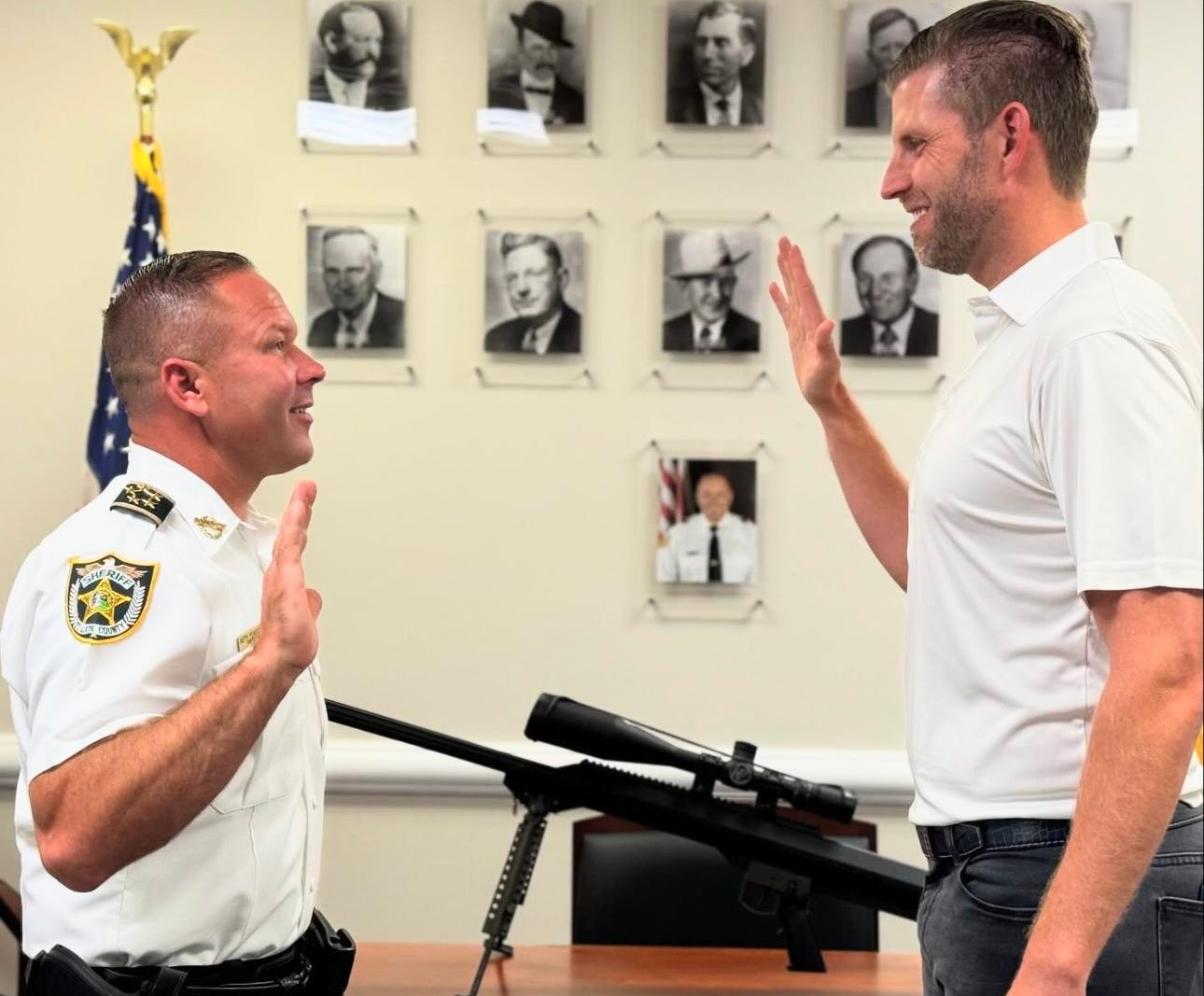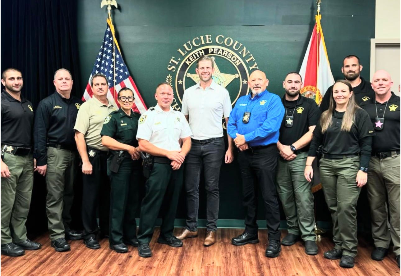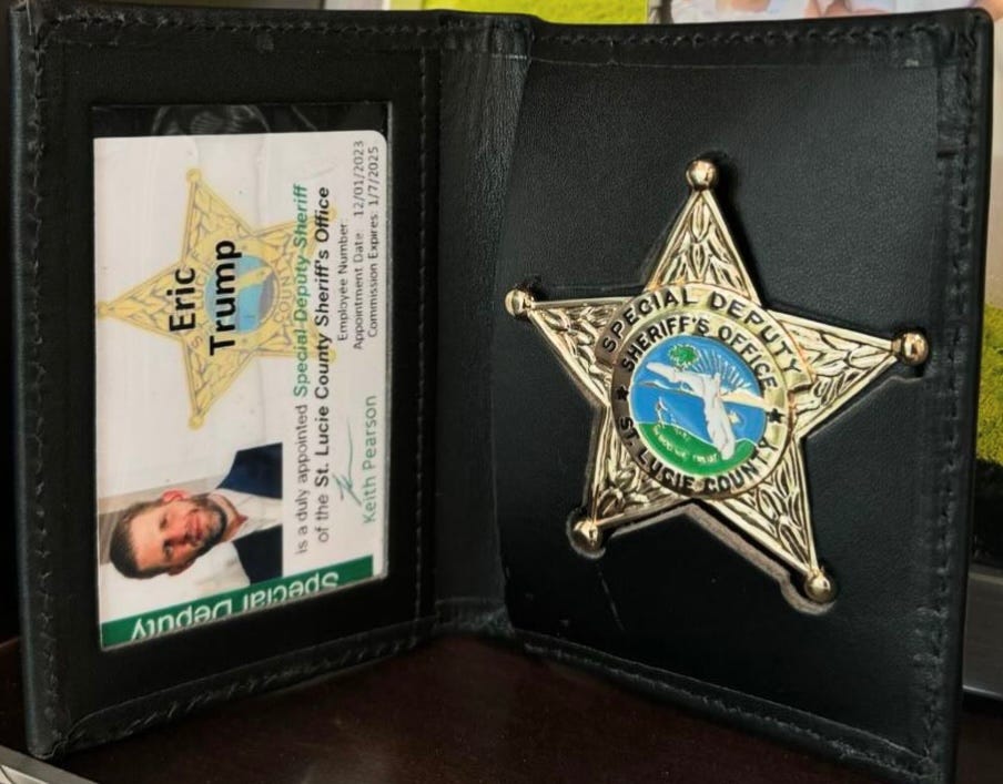 Eric Trump was just appointed as a Special Deputy Sheriff by St. Lucie (FL) County Sheriff Keith Pearson. Pearson was appointed Sheriff from Lieutenant over several other more senior members of the agency by Ron Desantis last December after the sudden and unexpected retirement of former Sheriff Ken Mascara. His appointment came as a surprise, but he attended several campaign events for Desantis when the others stayed out of politics, so he knew how to push the right buttons in Florida to leap over people more qualified.