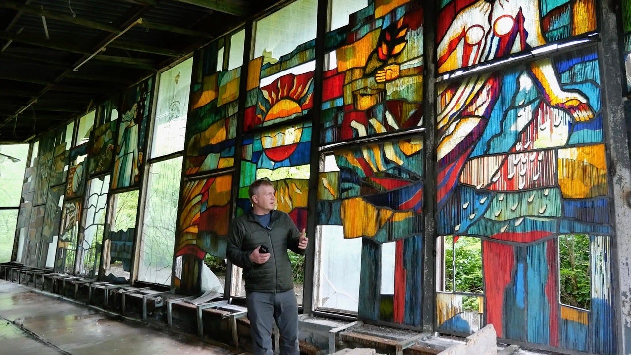 Our van stopped in a clearing, and we followed a path through the forest to a ruined restaurant on the riverbank. Inside, shattered glass crunched underfoot. One wall was an enormous stained-glass mural in the Socialist Realist style: a goddess sowing fields beneath a blazing nuclear sun. Even in its broken state, it rivaled the grandeur of Europe’s cathedrals.