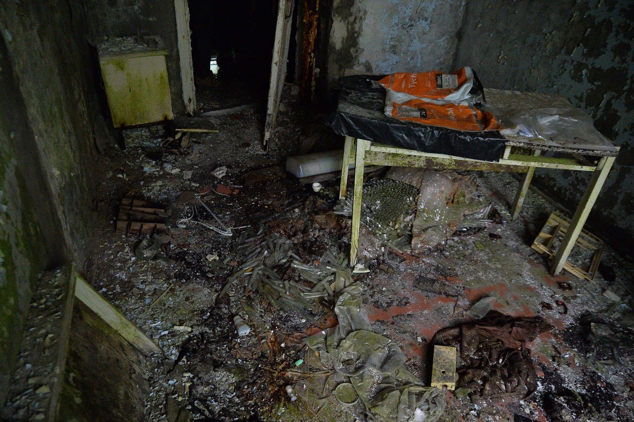 Inside, the air was heavy and damp. Mold spread like bruises across the walls. In one room, glass test tubes lay scattered across the floor; in another, files sprouted fungus where they spilled from a cabinet.