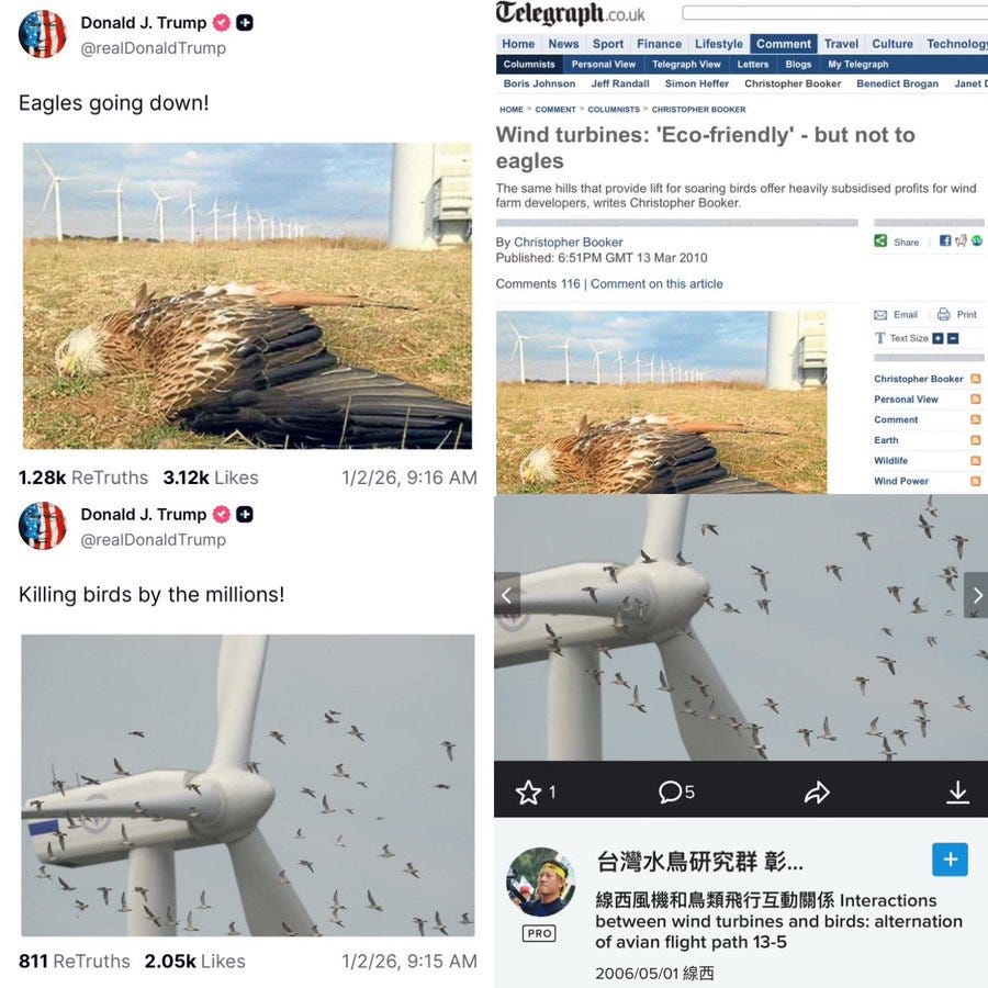 Trump followed up his health posts by sharing images he claimed showed bald eagles being killed by wind turbines in the United States. The problem is that none of it was true. One of the photos he shared was taken in Spain in 2010. The bird in the image isn’t even a bald eagle. It’s a red kite. Another image Trump posted came from Taiwan and dates back to 2006, when the wind turbines in question weren’t even operational. Still, Trump captioned the post with claims about turbines “killing birds by the millions.”