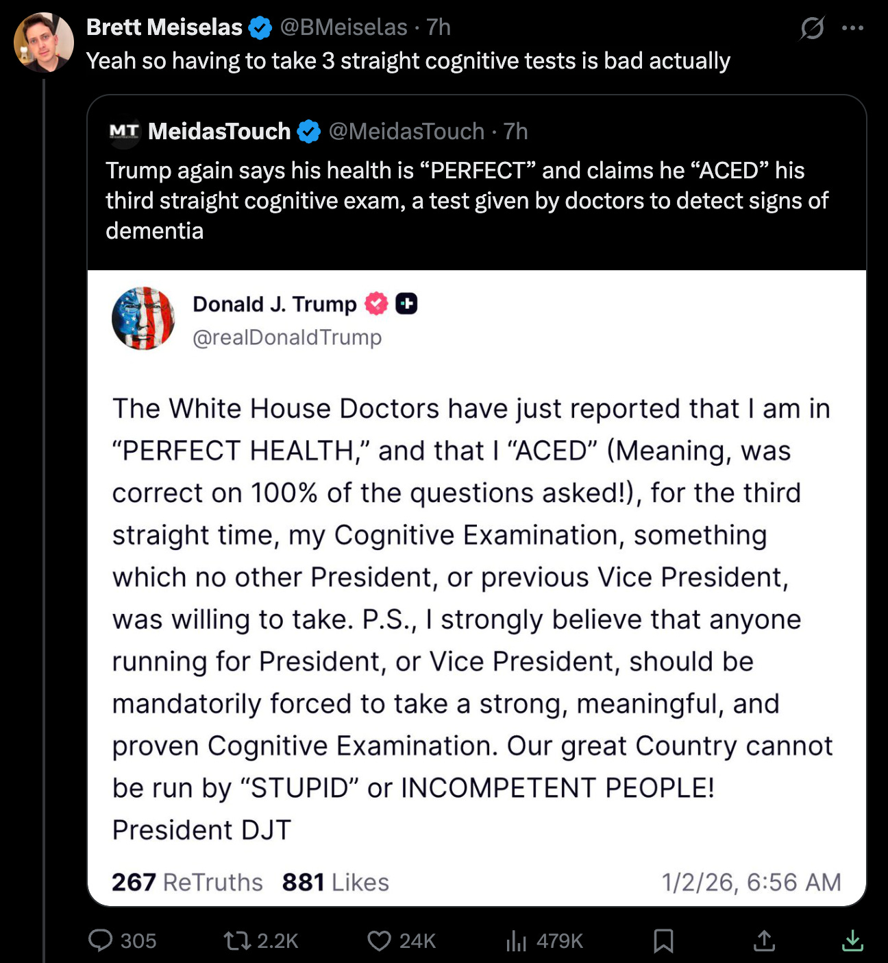 Let’s pause there. As a reminder, the test Trump is talking about, a MoCA (Montreal Cognitive Assessment) exam, is designed to screen for cognitive decline. It’s not something doctors have patients repeatedly take. That right there is a warning sign. The fact that Trump keeps bragging about taking it raises far more questions than it answers. Or as my brother Brett concisely put it on social media, “Yeah so having to take 3 straight cognitive tests is bad actually.” Trump has claimed to have taken this exam so many times now that it’s hard to keep track of the number. And yet this is what he chose to focus on during a Friday morning in 2026, while Americans are dealing with serious economic stress and global instability.