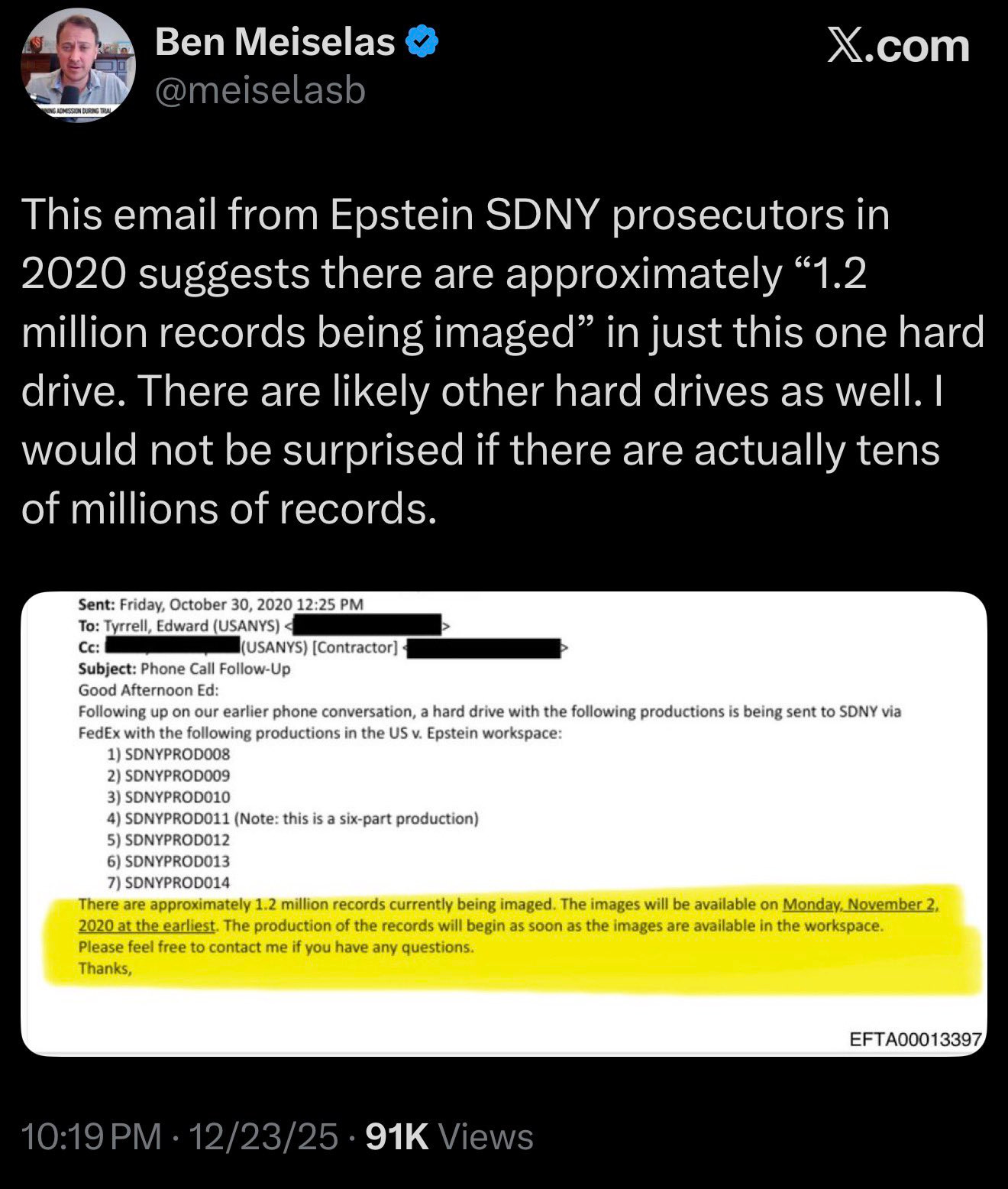 The DOJ says they have now just “uncovered” the existence of a million more documents related to the Epstein case, and that the process going through them will take weeks. This DOJ statement came hours after I reported this morning that there were millions of documents missing. I also called this out yesterday on social media. I discovered this by simply reading through the files. Why didn’t they?