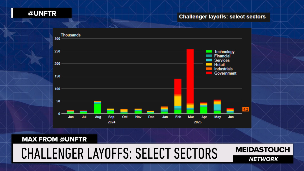 Here’s how these top line numbers work to mask the underlying data that no one seems to want to talk about. The pundit class looks at figures such as the Challenger, Gray and Christmas report known informally as the “Challenger Layoffs” and say things are improving compared to the previous quarter when DOGE was laying off government employees. As you can see below, June is better than May but if you go back to the end of the Biden summer numbers, they’re nearly double.