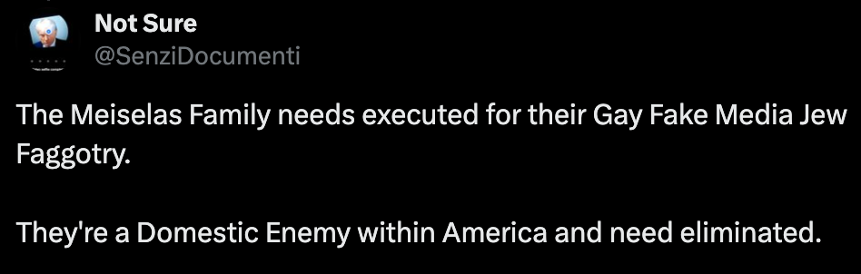 We have been getting increased death threats from accounts that look like this one—calling us the “domestic enemy” and saying that our entire family “needs to be executed,” along with other hateful slurs.