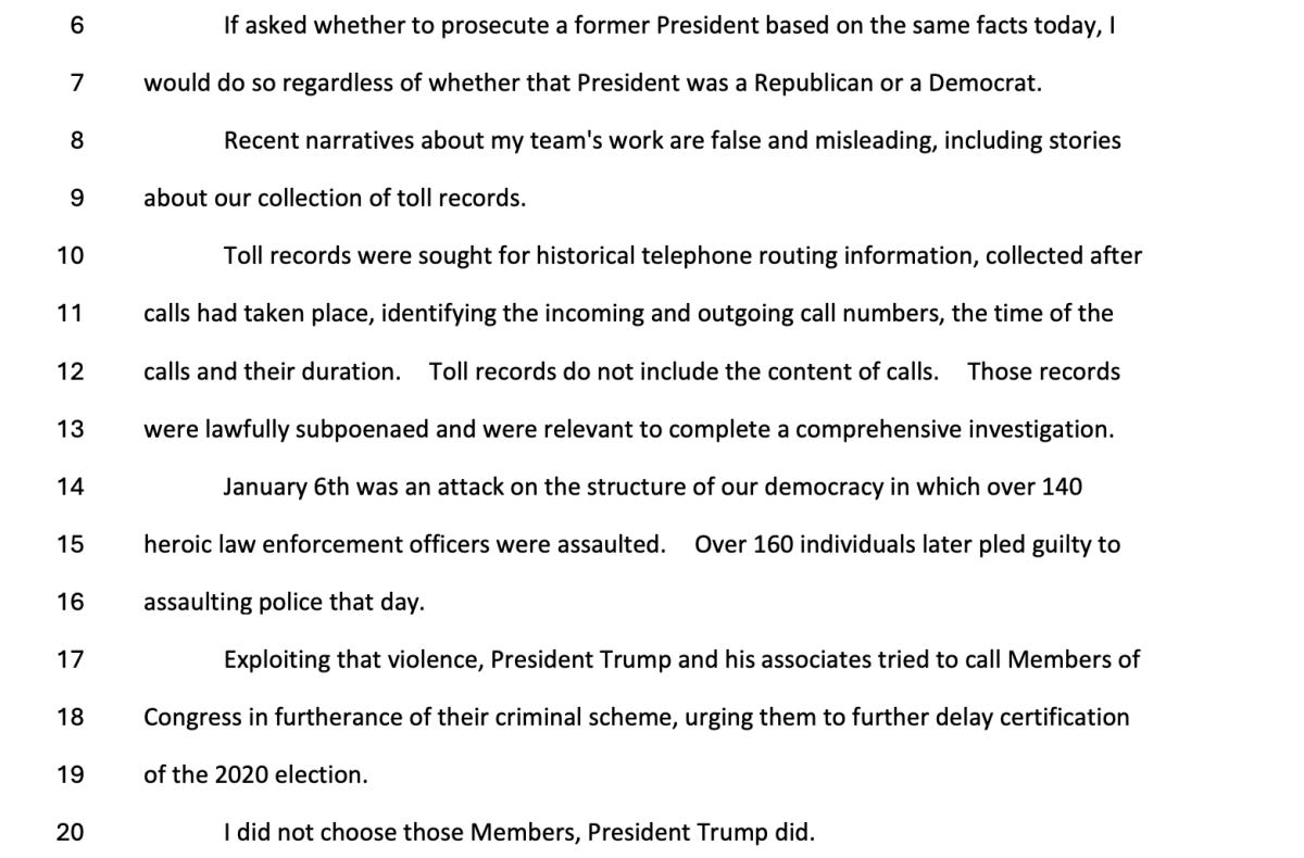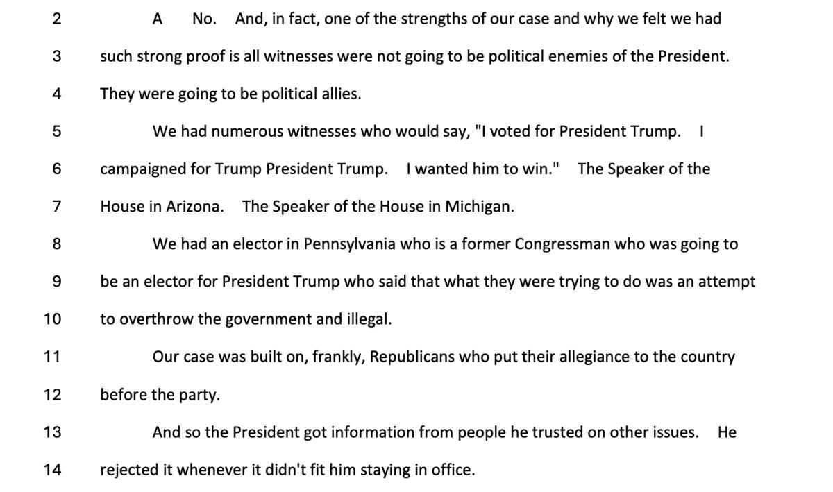 “We had numerous witnesses who would say, ‘I voted for President Trump. I campaigned for President Trump. I wanted him to win,’” Smith testified, citing Republican legislative leaders in Arizona and Michigan and a Pennsylvania elector who described the scheme as illegal and an attempt to overthrow the government.
