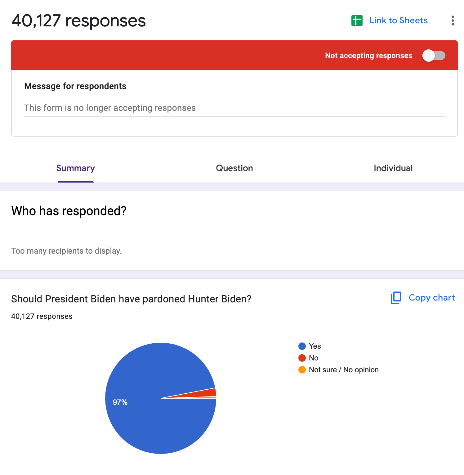 I’ll keep this short. We ran a poll on the MeidasTouch Network asking our viewers if they supported President Biden pardoning his son Hunter. To ensure accurate results, we required verification on the poll form to confirm respondents were humans, not bots.