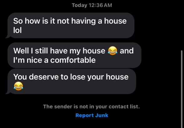 “So how is not having a house lol. Well I still have my house 😂 and I’m nice and comfortable. You deserve to lose your house 😂”