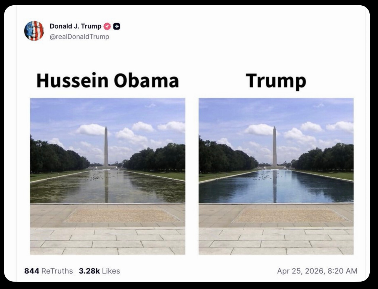 … Trump made a post where he claimed it was a mess when Obama was president. It received the following fact-check Community Note: “These images are identical, note the clouds and floating birds are the exact same, except the left image has been altered to make the water appear dirtier than in the original image. The original image was also taken in 2004, when George W. Bush was president.”