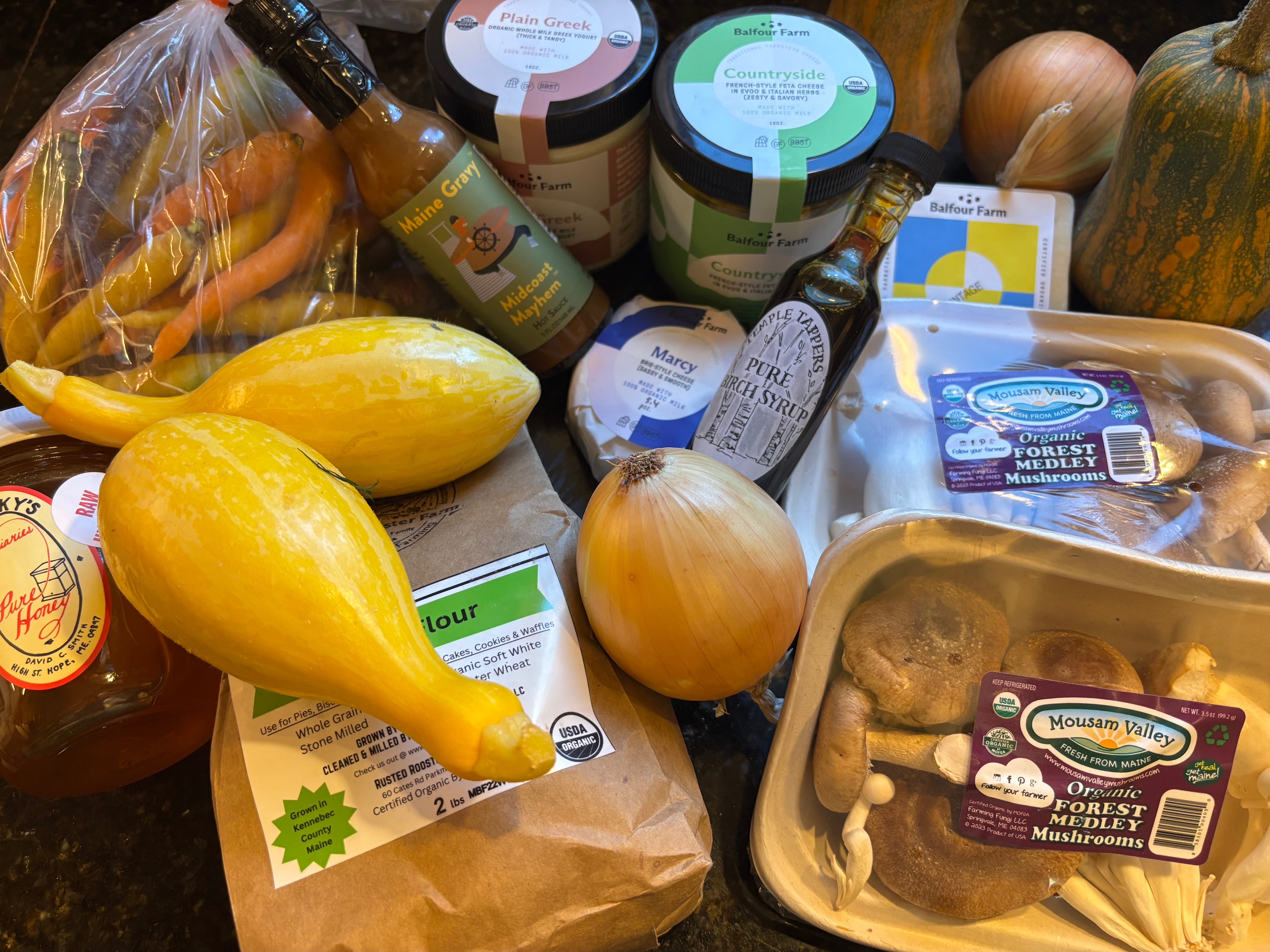 One comment to the last Bulletin asked me to post a photo of the stuff I bought this weekend at the Common Ground Country Fair of Made in Maine products. Here it is. Some cheeses, honey, hot sauce for oysters, veggies, pastry flour, and birch syrup. Made a lobster and mushroom risotto last night with all Maine ingredients except the Vialone Nano rice from Italy. A birch syrup vodka tonic with it. Made a chicken pot pie from scratch today will all Maine ingredients. The key to both were homemade (lobster and chicken) stocks.