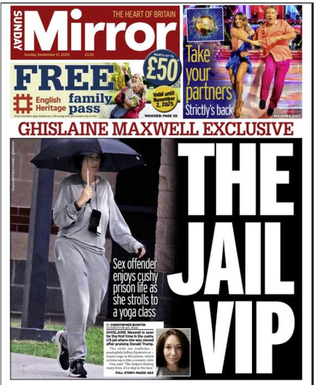… The Mirror: “Child sex trafficker Ghislaine Maxwell strolls to a yoga class in the cushy new lock-up where she is serving a 20-year stretch. The images have infuriated her victims – who were already angry at her move to the soft jail dubbed Camp Cupcake just 3 years into her sentence. The decision broke US prison rules which state that a sex offender cannot serve their time in a minimum-security facility like Fed Prison Camp Bryan, Texas.”