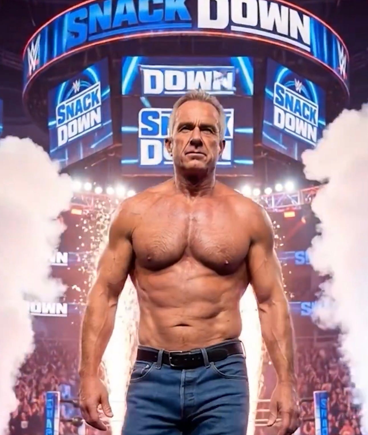 … Meanwhile, RFK Jr. posted a cringe AI video today depicting himself shirtless wearing jeans in a wresting match beating up a Twinkie. It was produced by HHS.