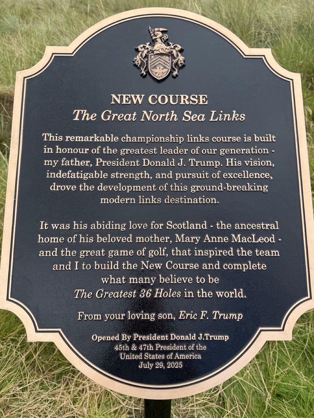… The official White House social media account promoted Trump’s ribbon cutting ceremony to open his new golf course in Scotland today. Stephen Miller posted a photo of the plaque near the first tee commemorating the opening of the course. Naturally, it was a tribute to Trump.