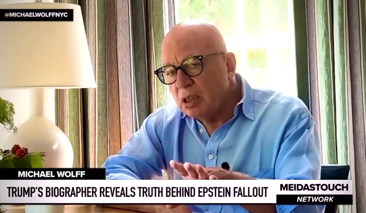 … Trump biographer Michael Wolff to Meidas: “Epstein’s explanation for why this friendship ended is as follows. In 2004, Epstein believed himself to be the high bidder on a piece of real estate in Palm Beach—a house. His bid was $36 million. He took his friend Trump around to see the house, to advise him on how to move the swimming pool. Trump thereupon went around Epstein’s back and bid $40 million for the house—and got the property. Epstein, who was well acquainted and in fact deeply involved with Trump’s scattered finances, understood that he didn’t have $40 million to pay for this house.”