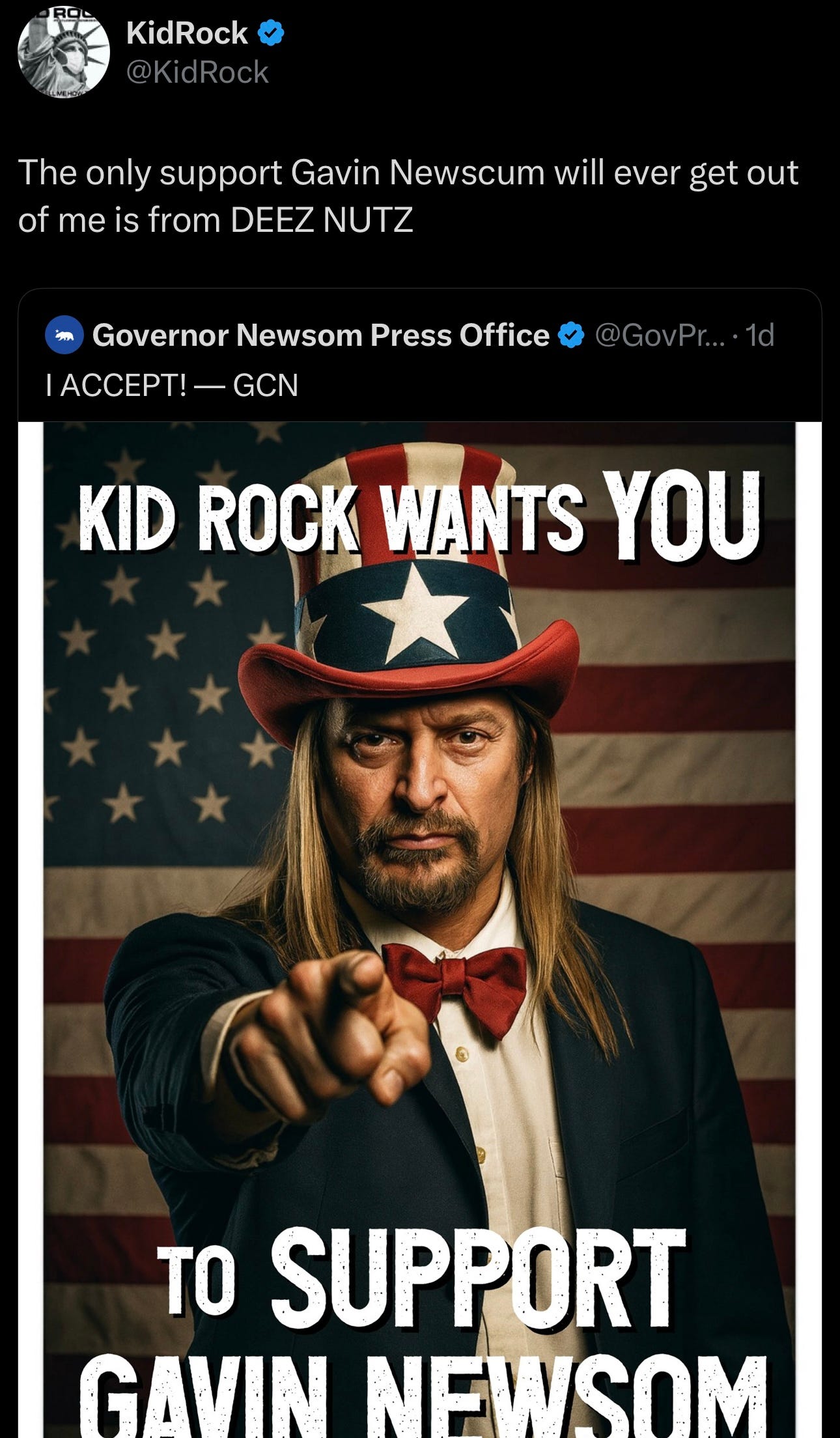 … Kid Rock took the bait and didn’t get the joke on one of Newsom’s latest troll posts: