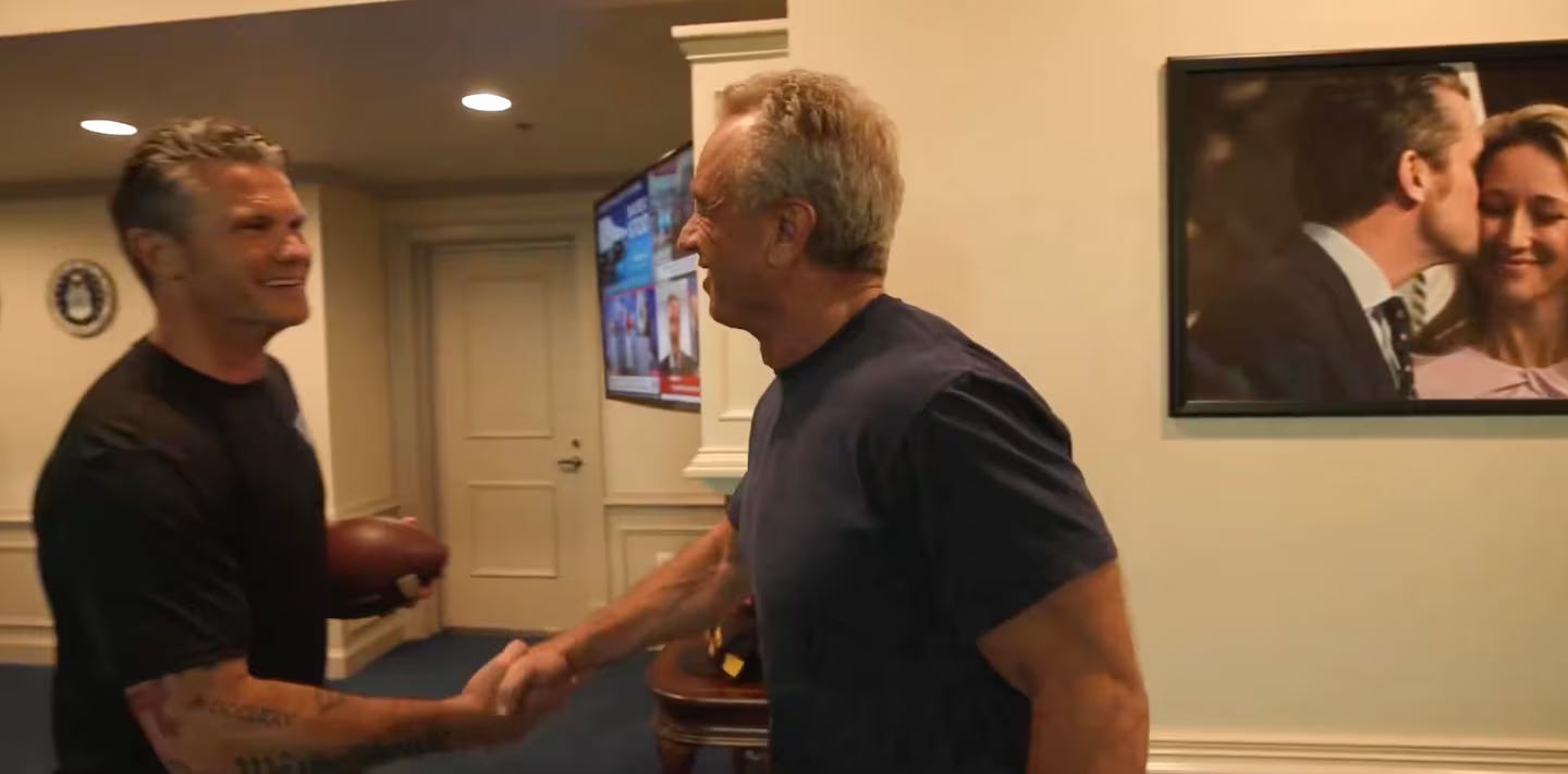 … SecDef Pete Hegseth has redecorated the Pentagon with photos everywhere of himself and his 3rd wife (a Fox producer he impregnated while married to his 2nd wife). Daily Beast notes that in a recent video showing Hegseth and RFK Jr walking through the Pentagon, “a photograph that shows Hegseth and third wife Jennifer Rauchet is on the wall as the pair shake hands. The photo of Hegseth and his wife originally included JD Vance in the foreground but he was unceremoniously cropped out of the picture.”