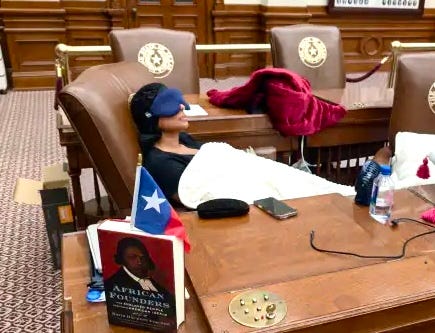… Collier to Meidas: "I refuse to sign away my dignity as a duly elected representative just so Republicans can control my movements and monitor me with police escorts. My constituents sent me to Austin to protect their voices and rights. When I press that button to vote, I know these maps will harm my constituents—I won’t just go along quietly with their intimidation or their discrimination. I refused to sign and so I was told that I was gonna have to stay here on the floor. They have locked the doors. The sergeants have been instructed not to allow me to leave until I have a permission slip.”