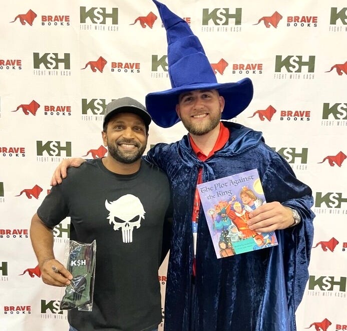 … This was Kash in 2022 when he was selling his Trump RussiaGate-themed children’s book, ‘The Plot Against The King’ with his other K$H merch like his line of tee shirts and hats. He also rented out a mock castle in Texas to promote the book where he had kids shoot watermelons with pics of Sen. Adam Schiff’s face on them from a trebuchet at the castle. I posted a video of it back then. Totally normal stuff.