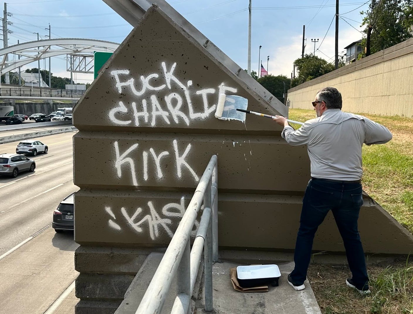 … Sen. Ted Cruz (R-TX) did a photo op where he had himself filmed painting over anti-Kirk graffiti near a highway so he could post it on social media. Interesting that the paint he is using exactly matches the graffiti that was supposedly painted on here by a leftist, and not the object he is painting. But I’m sure Ted wouldn’t stage a false flag photo op.