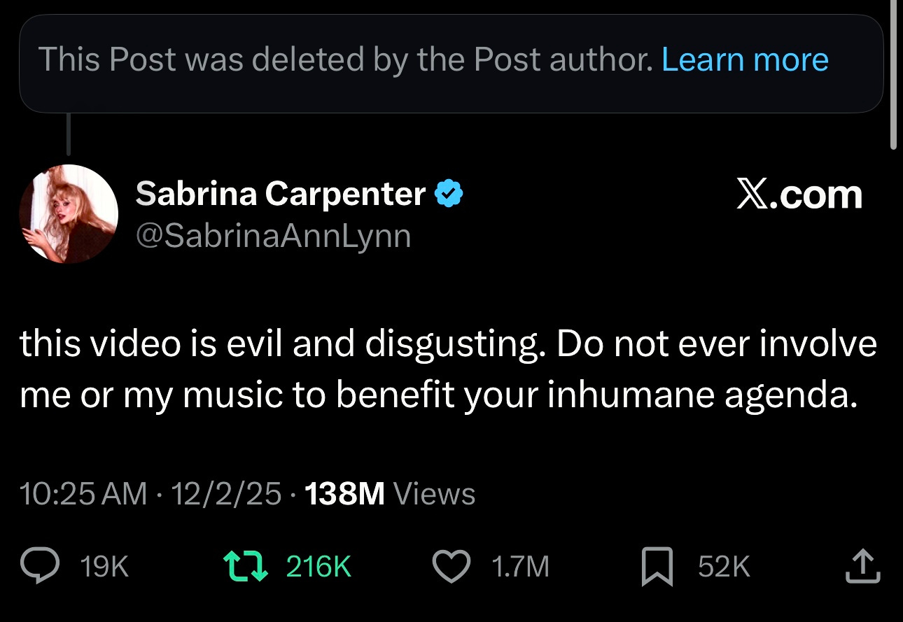 … Grammy-winning recording artist Sabrina Carpenter won her battle against the White House after they used her song in a repulsive ICE hype video. They deleted the video and surrendered after Sabrina’s scathing reply got to 138 million views on X.