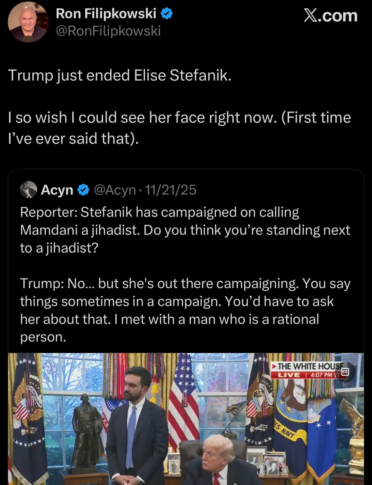 … This is what I posted on social media 15 minutes after Trump’s meeting with Zohran Mamdani started. The day the music died for Stefanik’s political career.