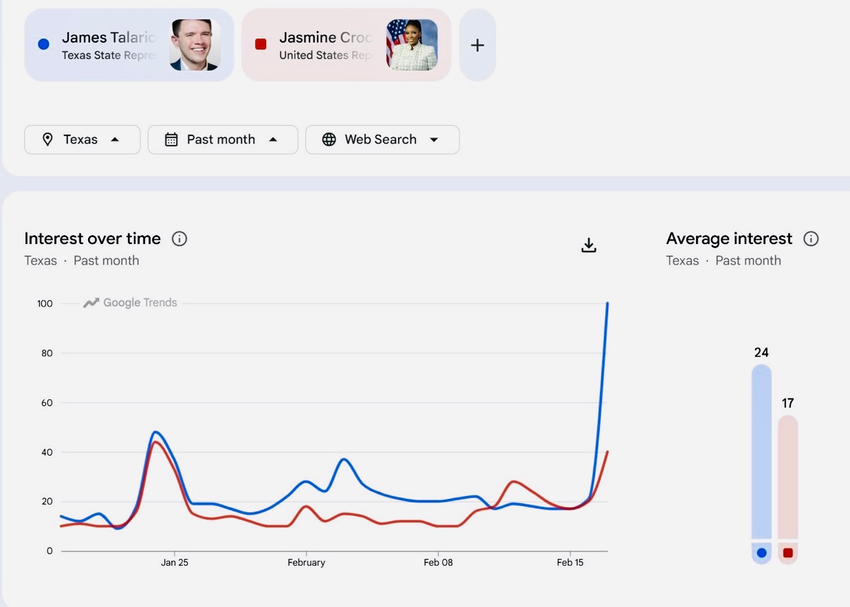 … Elections analyst Logan Phillips: “James Talarico is having quite a moment in Texas after the Colbert interview - and according to Google Trends, Texans are now searching his name at a very high rate just in time for early voting.