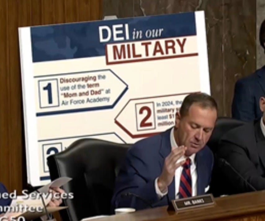 … Meanwhile, Eric Schmitt (R-MO) was railing about DEI resulting in unqualified people in the military getting promotions while the graphic behind him that he brought to the hearing had “military” spelled wrong.