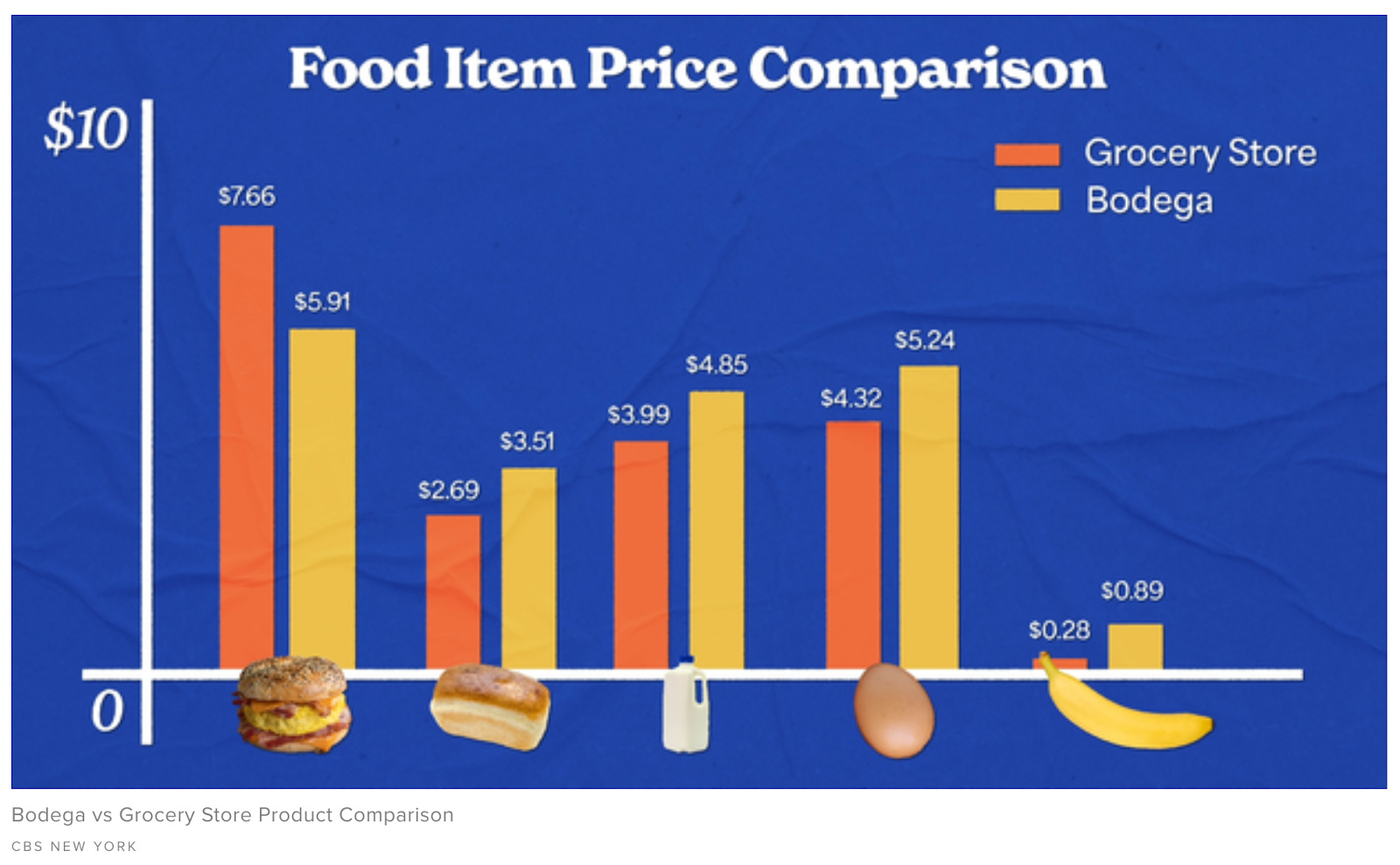 As you can see in the graph above, prices are higher in bodegas for every day items except for the New York culinary delight, the Bacon, Egg and Cheese on a roll. (Sometimes served on a bagel. We can have that debate, but what’s not up for debate is that our BEC’s with SPK, if you're a real one, are the best on the planet. That’s salt, pepper, ketchup. But I digress.)