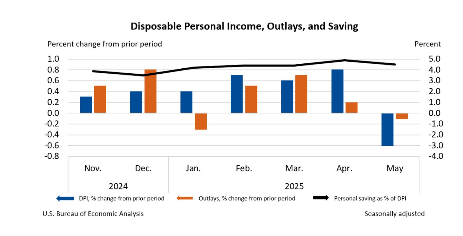 Look at those May figures. That’s the percent change from the prior month of disposable income in blue, or the left column, and actual spending on the right, or the orange column.