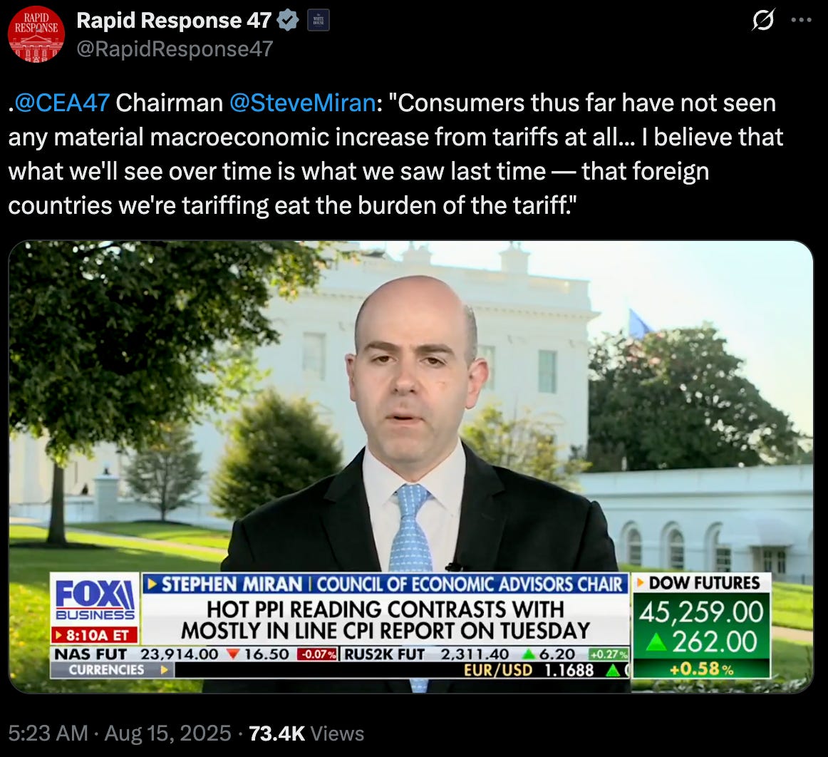 But yesterday the White House highlighted one of their top economists, Council of Economic Advisers Chair Stephen Miran, claiming on Fox Business that there has been “no material macroeconomic impact” from tariffs.