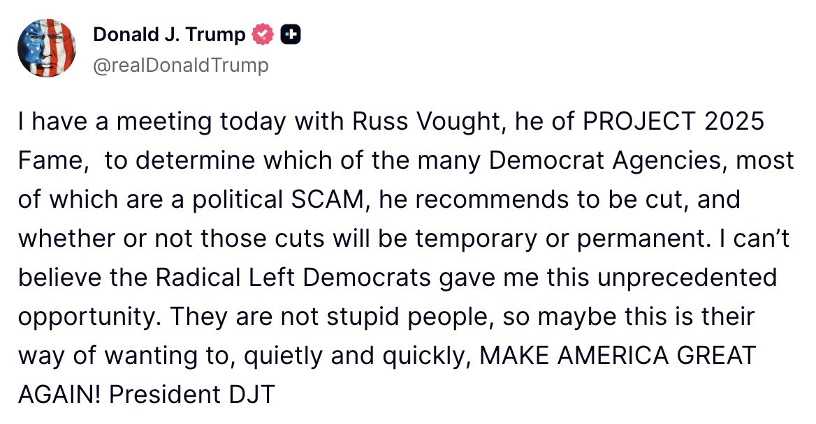 Yesterday, Donald Trump proved beyond any doubt that his months of denials about Project 2025 were nothing more than another one of his signature lies. On Truth Social, in the middle of a government shutdown he helped engineer, Trump boasted about meeting with Russ Vought — “he of Project 2025 fame,” as Trump himself put it. He said the meeting was to determine which “Democrat Agencies” (his words) should be cut, and whether those cuts should be temporary or permanent. Then he added a taunt: “I can’t believe the Radical Left Democrats gave me this unprecedented opportunity. They are stupid people, so maybe this is their way of wanting to, quietly and quickly, MAKE AMERICA GREAT AGAIN.”