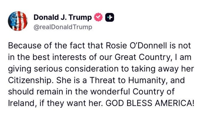 This morning, Trump posted that he is “giving serious consideration to taking away [Rosie O’Donnell’s] Citizenship.” His reason? She criticized him. That’s it. His deranged statement concluded with a pathetic “GOD BLESS AMERICA!” in all caps.