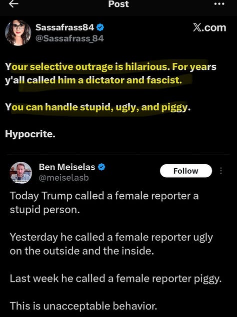 Once again, MAGA exposes itself. My original post simply said that it was unacceptable for Trump to call female reporters those names. That’s literally all I said. It is telling that this triggered Trump’s supporters to attack me and MeidasTouch so viciously with death threats and slurs.