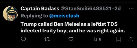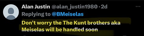Some of Trump’s other supporters then went on to threaten my life. One example is an account that said, “the Kunt brothers aka Meiselas will be handled soon.” Another account said, “Trump called Ben Meiselas a leftist TDS-infected fruity boy, and he was right again.” A number of other accounts made antisemitic slurs and others used more despicable slurs.