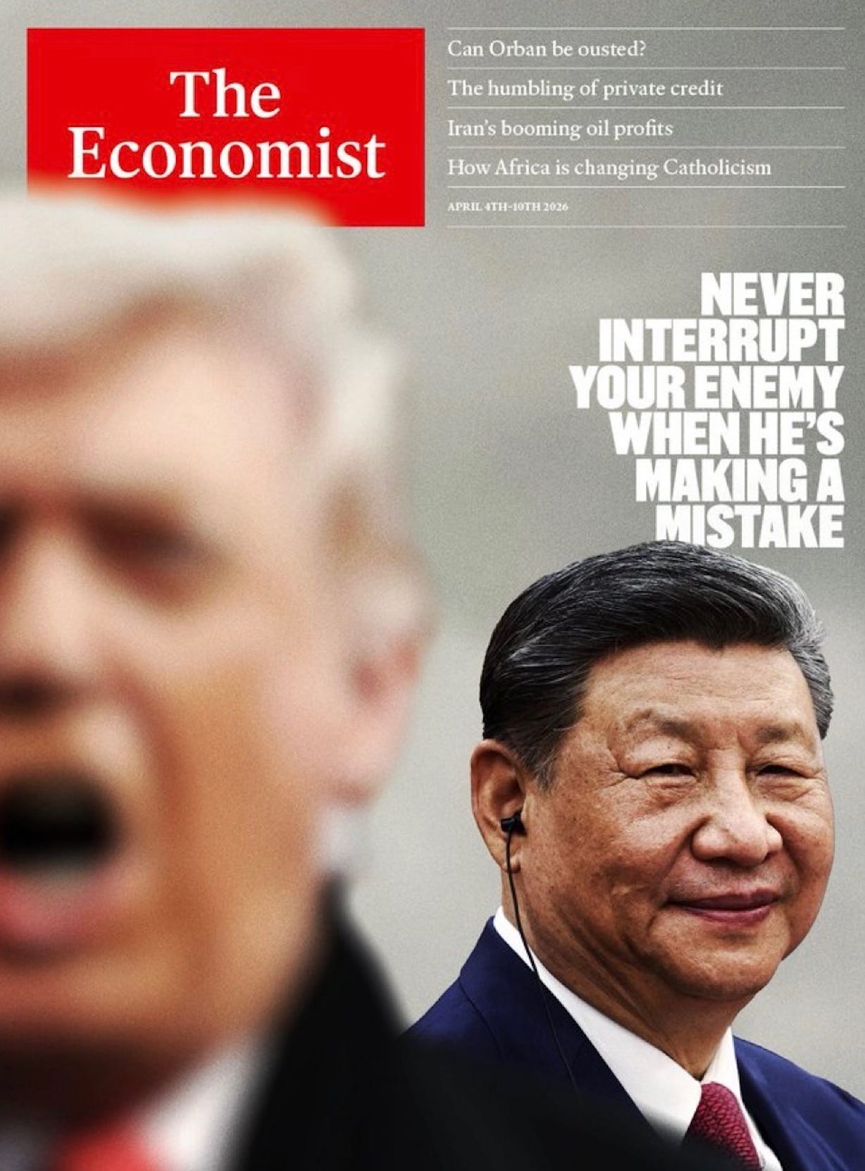 The Economist’s cover today pretty much captures the global mood. It shows Xi Jinping smiling broadly behind a blurry, yelling Trump, with the headline: “Never interrupt your enemy when he’s making a mistake.” The magazine spoke to diplomats, scholars, and current and former officials in China — nearly all of them view Trump’s war on Iran as a serious American error that is significantly benefiting China, Russia, and Iran simultaneously. When your foreign policy has unified your adversaries while alienating your allies, something has gone badly wrong.